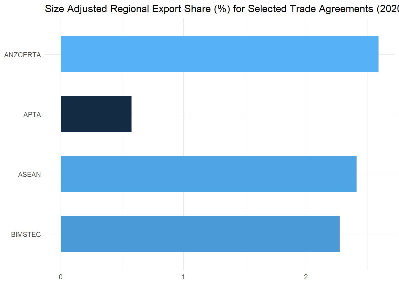 What does it tell us? The export share tells us how important a particular export partner is in terms of the overall export profile of an economy. Changes in the export share over time may indicate that the economies in question are becoming more integrated. In the case of intra-regional export shares, increases in the value over time are sometimes interpreted as an indicator of the significance of a regional trading bloc if one exists, or as a measure of potential if one is proposed. The latter assumes that groups with high shares are in some sense ‘natural’ trading partners.