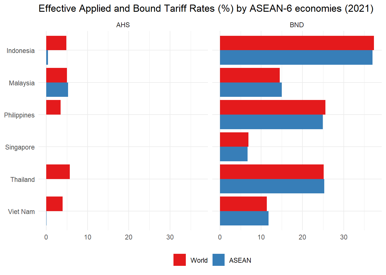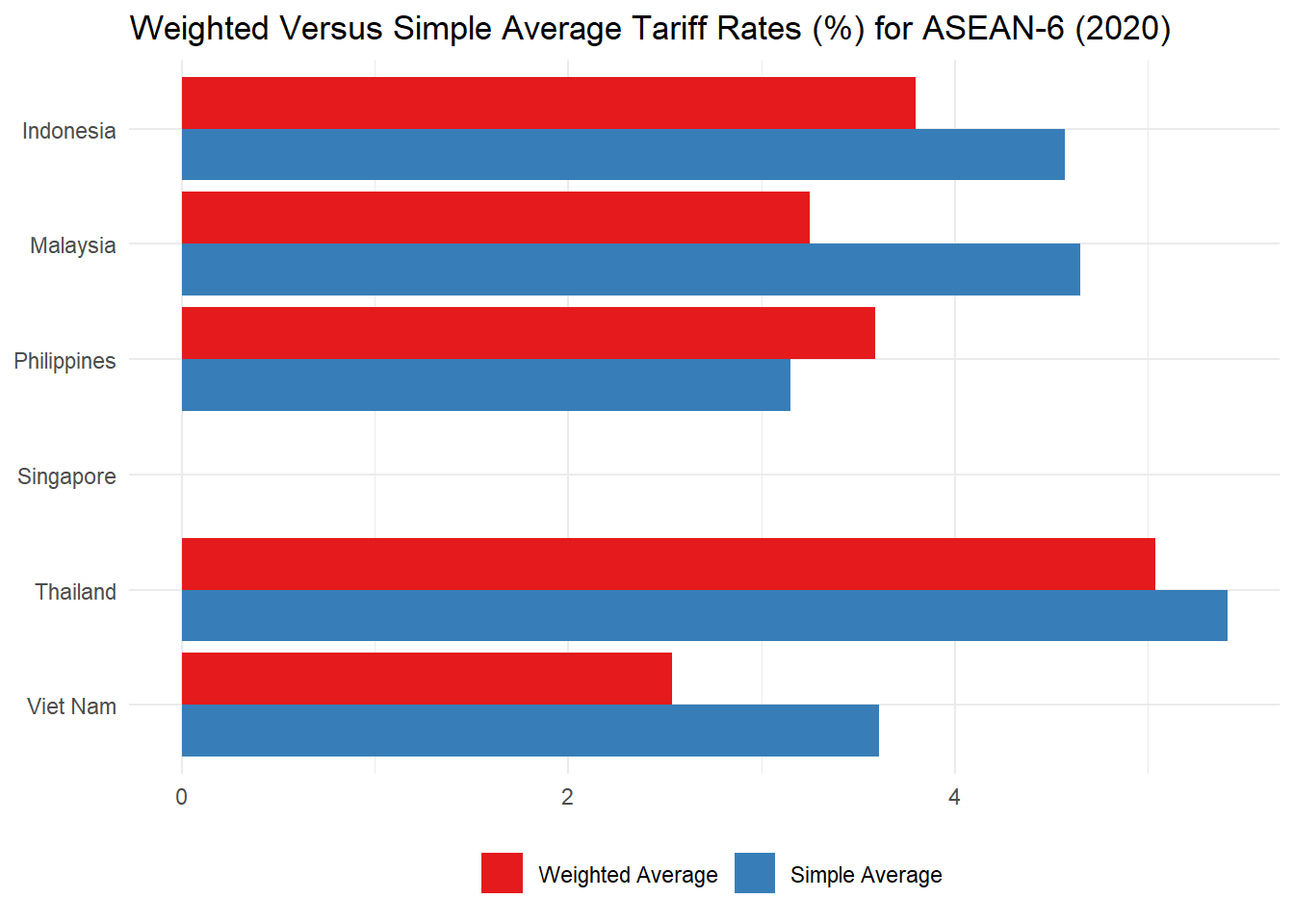 labs(title = "Weighted Versus Simple Average Tariff Rates (%) for ASEAN-6 (2020)", x = NULL, y = NULL, fill = NULL) +