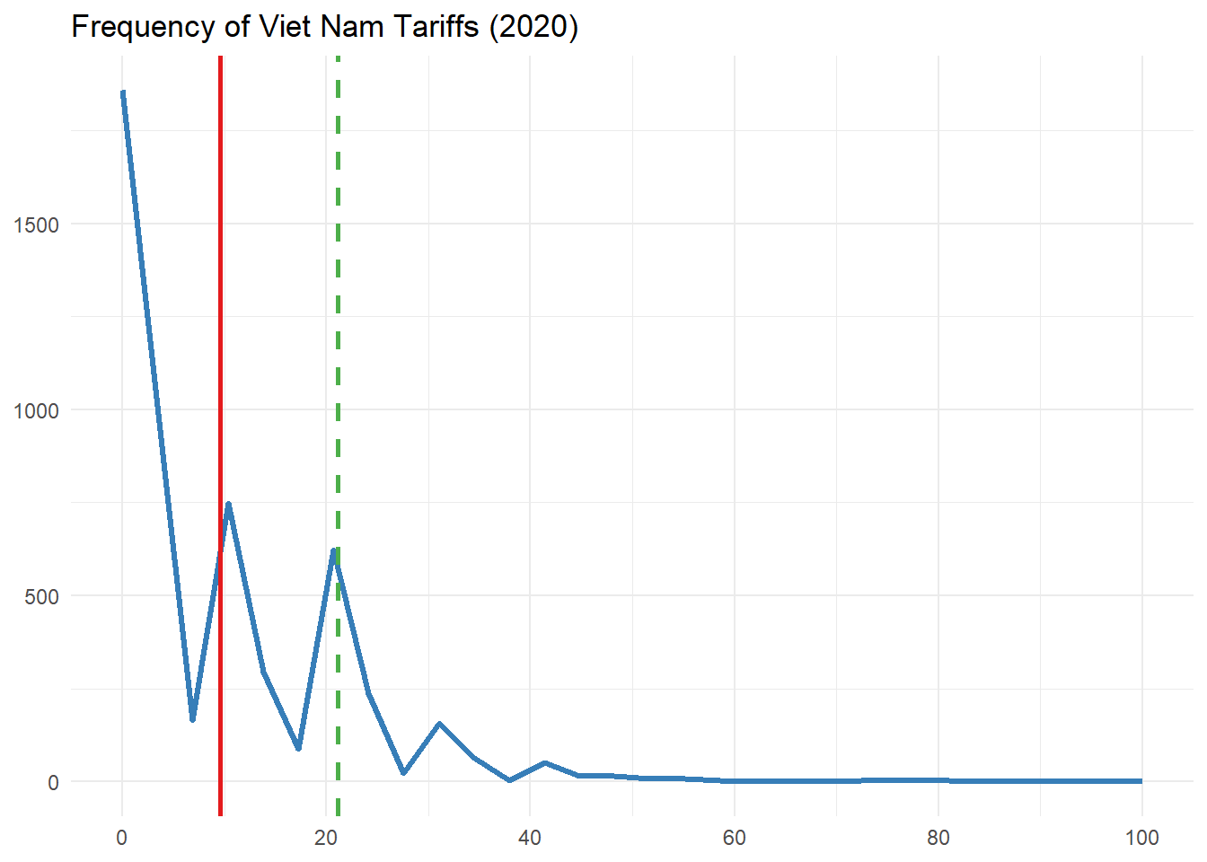 labs(title = "Frequency of Viet Nam Tariffs (2020)", x = NULL, y = NULL, color = NULL) +